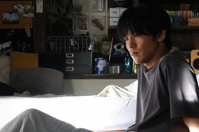 ベッドではなく床に敷いた布団で目を覚ます月岡夏(目黒蓮)。