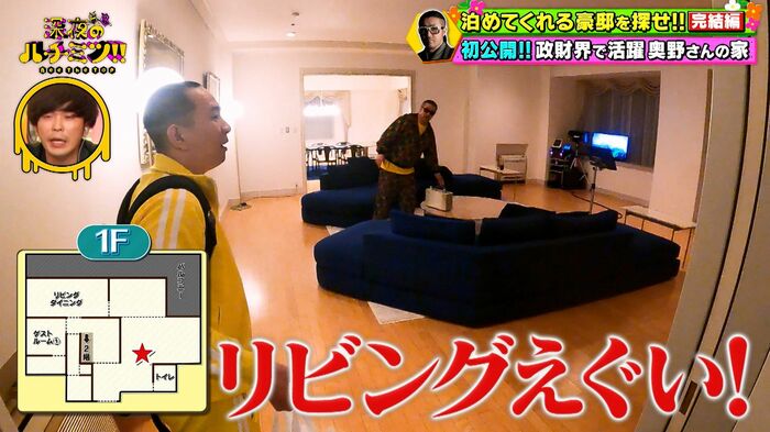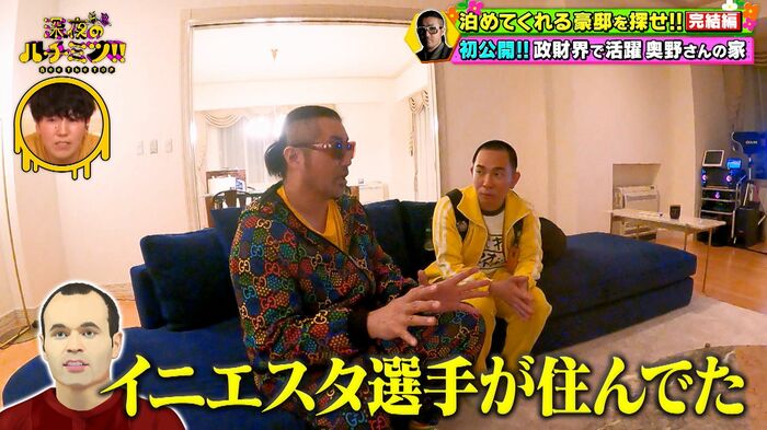 宿泊交渉は即OKとなり、奥野さんと自宅へ向かったソマオさん。自宅前に着くと「家じゃないみたい。…広すぎて、怖い」と半べそに。それもそのはず、トイレだけで5つある7LDKの豪邸で、前の家主は、昨年まで日本でプレーしていたサッカーのイニエスタ選手とのこと。ソマオさんは仰天が止まりません。