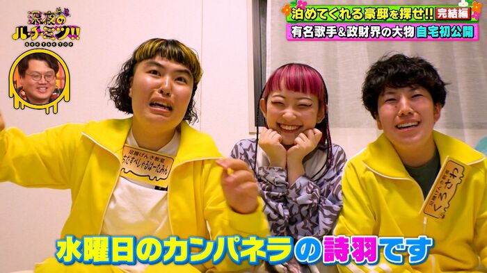 足腰げんき教室は、青山で行きついた超大物芸能人の子息との交渉が実らず、焦る気持ちを抱えて新宿へ。そこで偶然出会った飲み会帰りの先輩芸人から、水曜日のカンパネラの詩羽さんに連絡してもらうことに。期待は高まるも、夜の10時過ぎに人気アーティストにアポなし交渉がまとまるはずなどない…と誰もが思ったところ、なんとまさかのOKが!