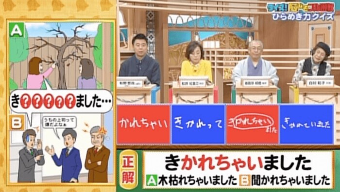 正解は「きかれちゃいました(木、枯れちゃいました/聞かれちゃいました)」。