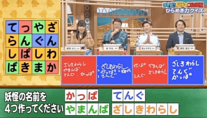 正解は「かっぱ(河童)」「てんぐ(天狗)」「やまんば(山姥)」「ざしきわらし(座敷童子)」。