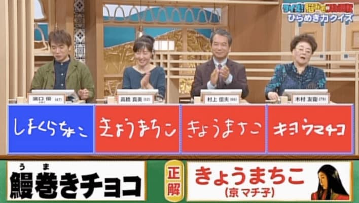 「鰻巻きチョコ」。この文字をひらがなに変換してから、有名人の名前に並べ替えてください。