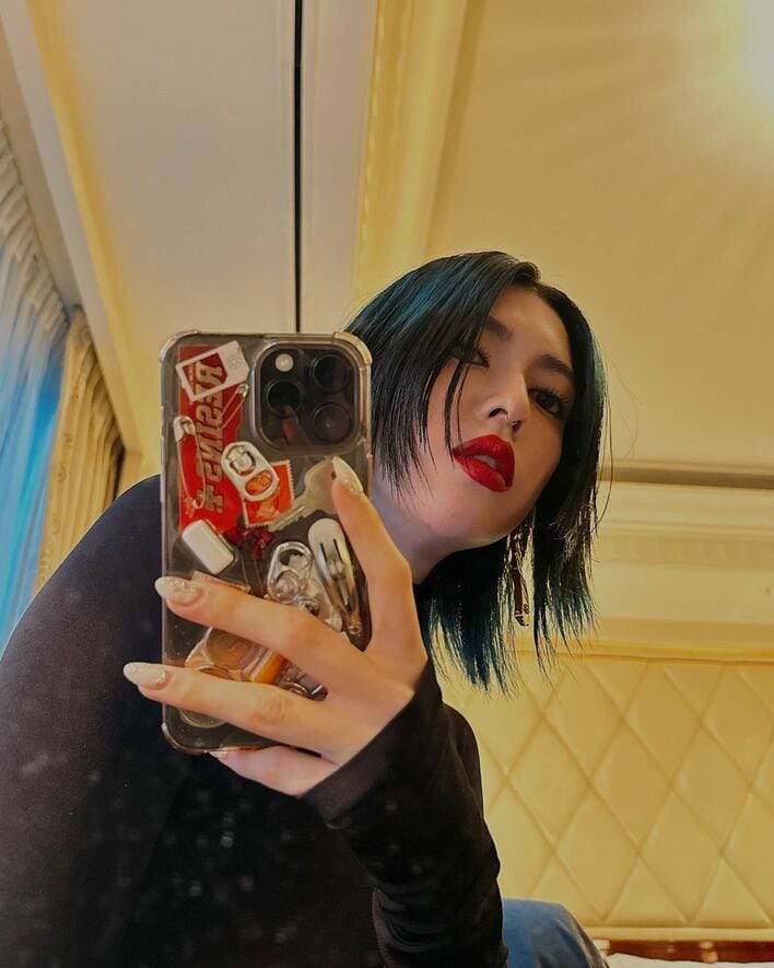 赤い髪色の三吉さんが黒のハイネックのアウターを着てカメラを見つめる近距離ショットも公開し、それぞれ違ったヘアスタイルの写真を9枚披露!