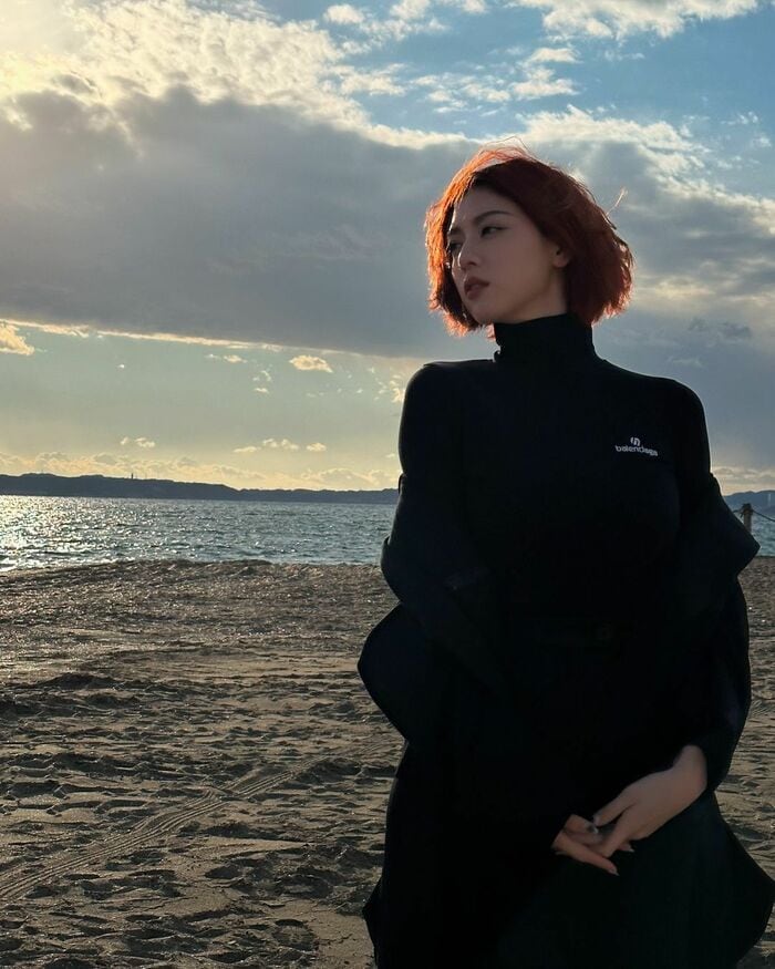 海を背景にして、オレンジのボブヘアの三吉さんがポーズを決めているショットも。
