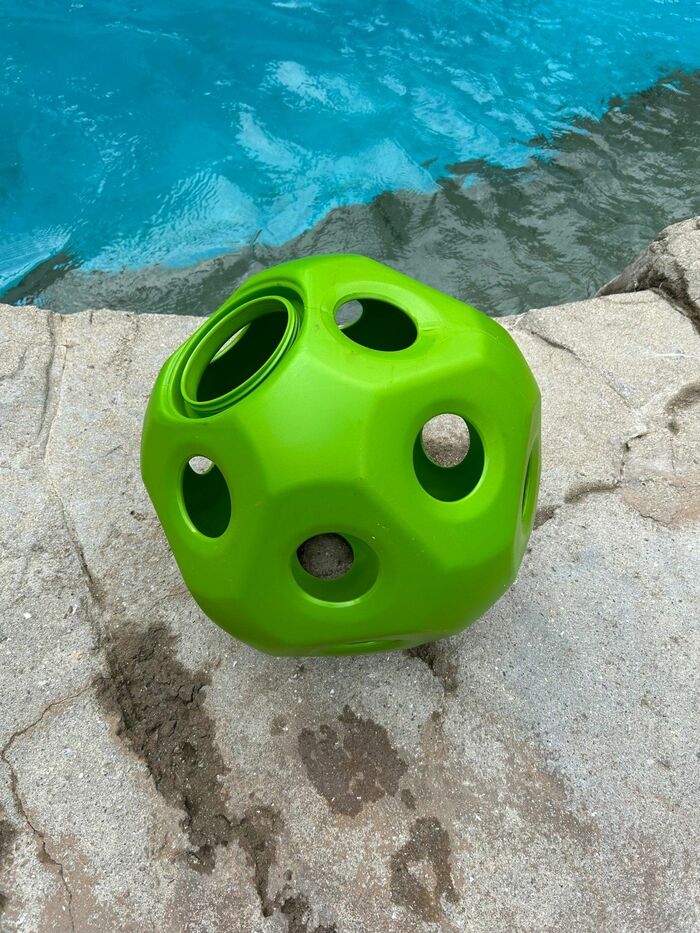 「!?」プールに浮かぶ緑色の新しいおもちゃに気が付き…