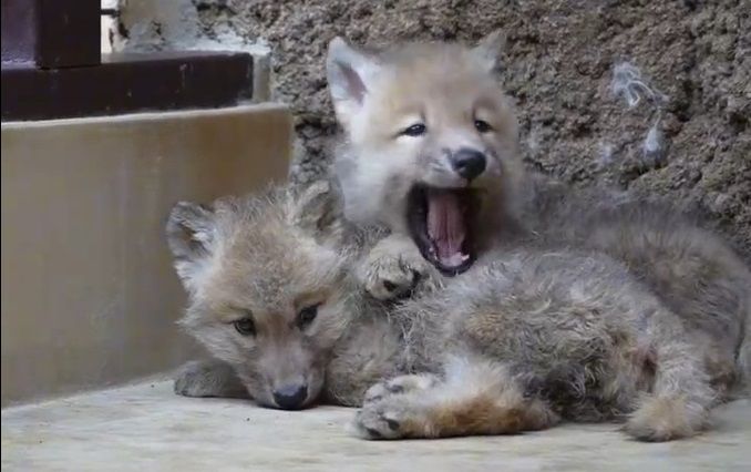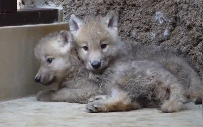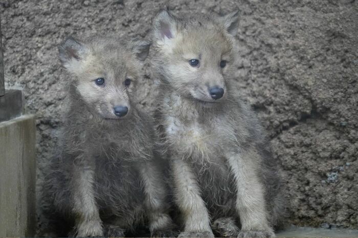 那須どうぶつ王国で暮らす、2024年5月16日に生まれたばかりのホッキョクオオカミのオスとメスの2頭。