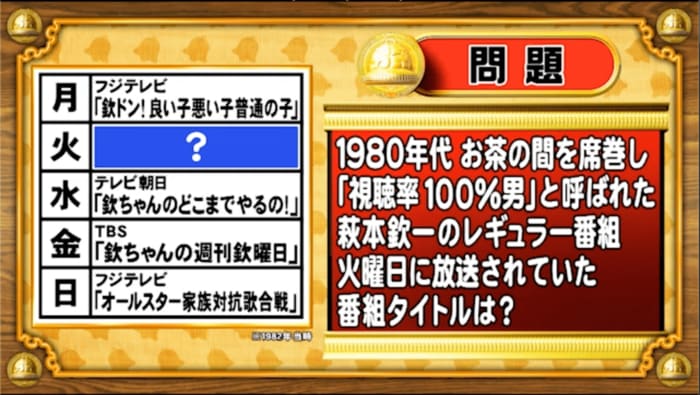 今からおよそ40年前の1980年代、お茶の間を席巻し、「視聴率100%男」と呼ばれた萩本欽一さんのレギュラー番組の中で、毎週火曜日に放送されていた番組のタイトルは何でしょうか?