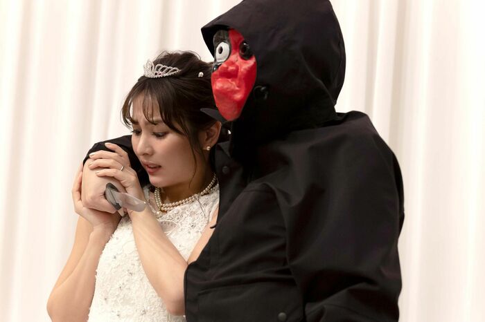 男に指示され、柘植のマネージャー・南佐江(うらじぬの)が参列者の腕時計やアクセサリー、ご祝儀を袋に集める。さらに男は柘植に「今すぐ5千万円を用意しろ」と要求するが、柘植は「無理です」とそれを断った。