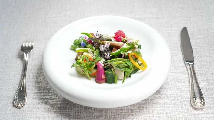 ふきと牛肉のソースとキャビアの塩気で味付けされたこの一皿には、アスパラ、小松菜、イタドリなど全て松本産の50種類以上の野菜が入っているそう。