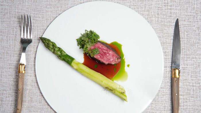 続いては、白い皿にアスパラの緑と牛肉の赤身のコントラストが美しい「小林さんのアスパラと信州牛カイノミのロースト」をいただくことに。田邉さんは「アスパラが主役」と自信をにじませます。