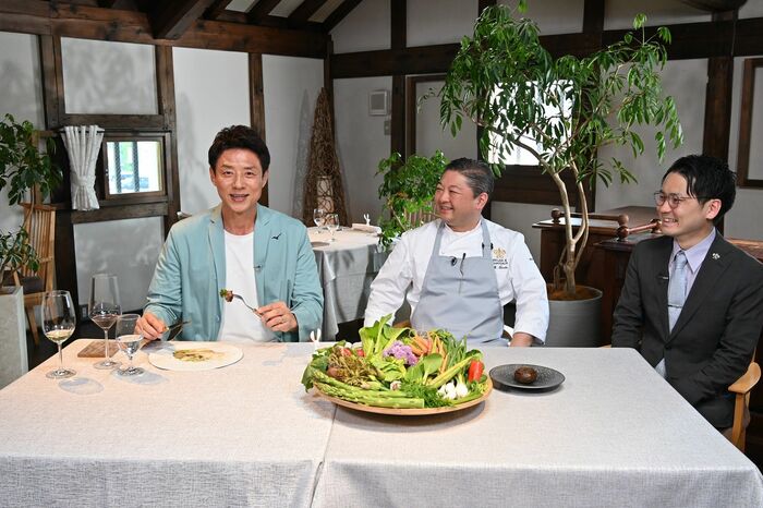 「野菜の生産者のことを職人だと思っている」とシェフの田邉真宏さんの言葉に、松岡さんは「では、食べるだけの職人として」と笑いを誘います。