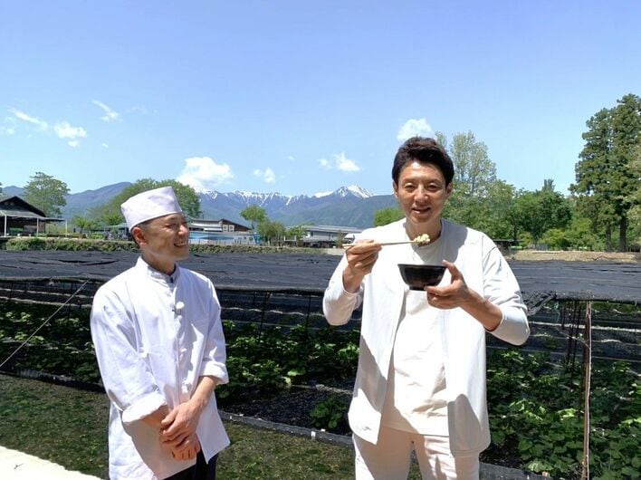 「大王わさび農場」を訪れた松岡さんは、「大王庵」の料理長、藤井一幸さんに、わさびのおいしい食べ方を教えてもらうことに。
