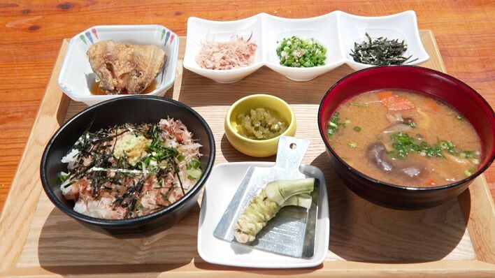 丼によそったごはんの上に、「ほろっこ漬け」(わさび茎の甘酢漬け)をのせ、かつお節、青ねぎ、刻み海苔をのせたらしょうゆをひと回し。そして最後におろしたてのわさびをのせますが、最後にする理由は、温かいごはんの上に直接のせると、熱でせっかくの香りと辛味が飛んでしまうからだそう。