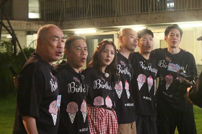 みんなで板野友美さんがデザインしたTシャツに着替えてまったりしていると、進行役の野村和生プロデューサーから「そろそろお開きの時間」だと伝えられます。合同誕生日会を締めくくるにふさわしい1曲ということで、7月3日生まれの岡崎体育さんがフラワーカンパニーズをカバーした「深夜高速」を肩を組んで仲良く合唱。