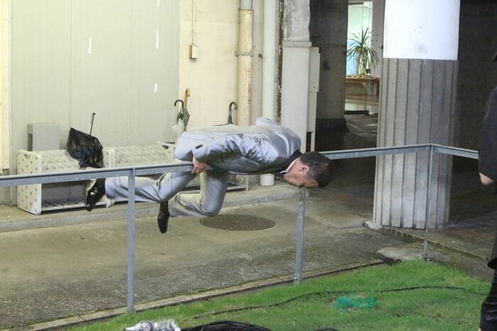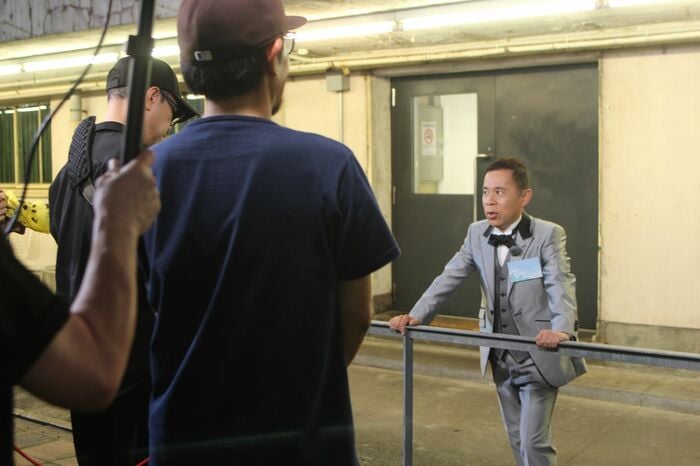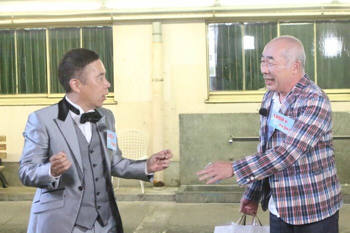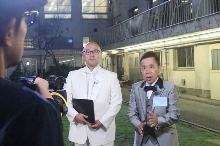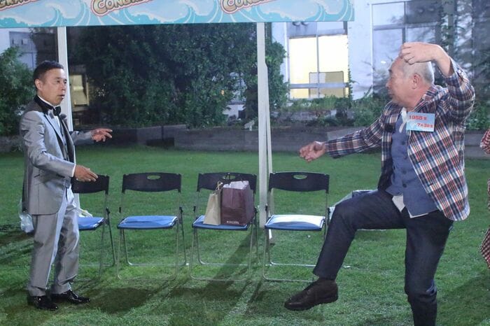 小雨が降る撮影地である吉本興業東京本社の中庭に岡村さんが登場すると、片岡飛鳥総監督から数時間後には岡村さんの54歳の誕生日を迎えると告げられ、白いタキシードの正装で決めたフジテレビの野村和生部長から今回は「7月3日生まれの合同誕生会」だと明かされます。