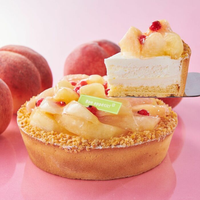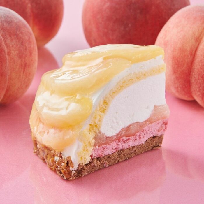 爽やかな酸味のレアチーズクリームと、カスタード入りホイップクリームで使ったタルトの上に、甘くてジューシーな完熟桃がぜいたくに乗ったケーキは、酸味と甘く濃厚な香りが楽しめます。