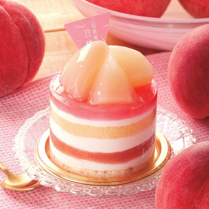 ヨーグルトクリーム、白桃ソース、白桃シロップ漬けにスポンジなどで多層になったケーキにレモンとミントシロップに付けた旬の山梨県産の桃をトッピング。白桃のやさしい甘さが絶妙にマッチしたさっぱりジューシーな味わいが特徴です。