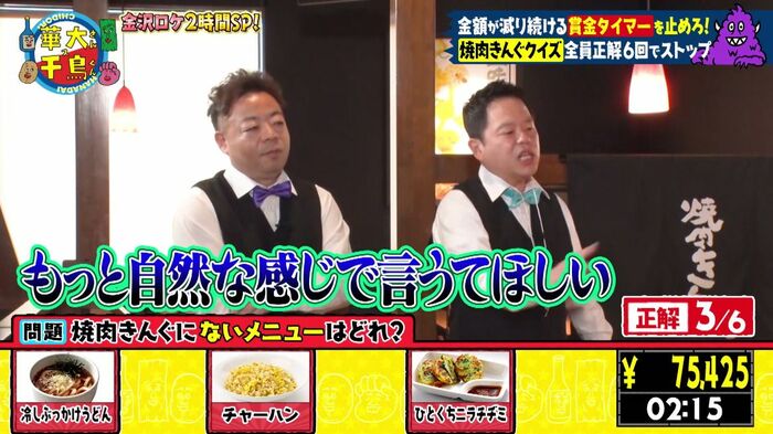 「一番人気のお酒に合う逸品メニューはどれ?」では「さすがにキムチ!」(ノブ)と口走り、「焼肉きんぐにないメニューはどれ?」では「チャーハン!」(濱家)と悪びれることなく言い放って、相談禁止のルールを無視。
