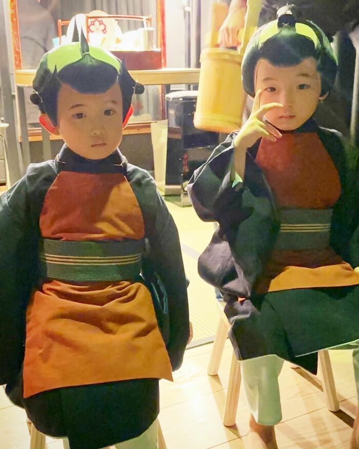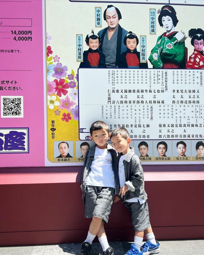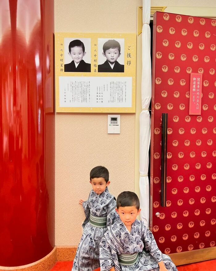 獅童さんは、「先日陽喜と夏幹の初舞台披露公演無事に終えることができました」というコメントとともに息子である陽喜くん(6)と夏幹くん(4)の舞台の合間の写真を複数枚公開。