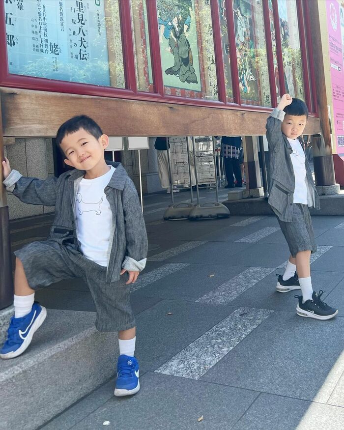 息子の陽喜くん(6)、夏幹くん(4)が出演する初舞台披露公演が終わったことを報告、2人のオフショットを掲載いたしました。