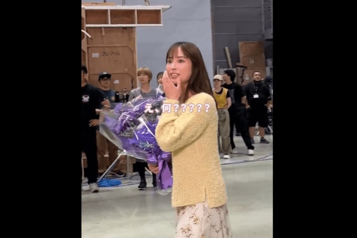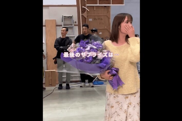 動画は、広瀬さんが花束を抱えながら「え、何!?」と動揺する場面からスタート。
