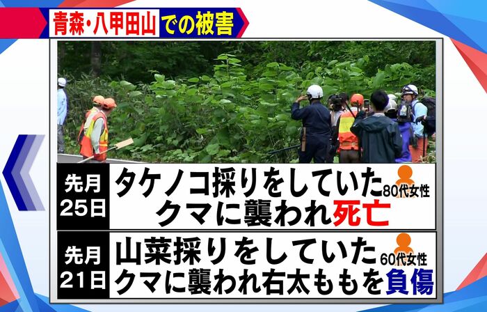 青森県の八甲田山では、6月21日に女性がクマに襲われ右足の太ももを負傷。同月25日には、タケノコ採りをしていた80代の女性がクマに襲われ死亡しています。