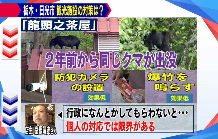 2年前から同じクマが出没しているという「龍頭ノ茶屋」では、防犯カメラを設置し、出没した際は爆竹を鳴らすなどして追い払っていますが、すぐに戻ってきてしまうため、行政の力を借りないと厳しい現状があるといいます。
