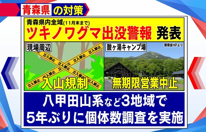 女性の死亡を受け、青森県は県内全域に「ツキノワグマ出没警報」を発表。(11月30日まで) 市や県など関係機関が現場周辺の入山規制を実施。酸ヶ湯キャンプ場は無制限の営業中止となりました。