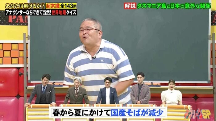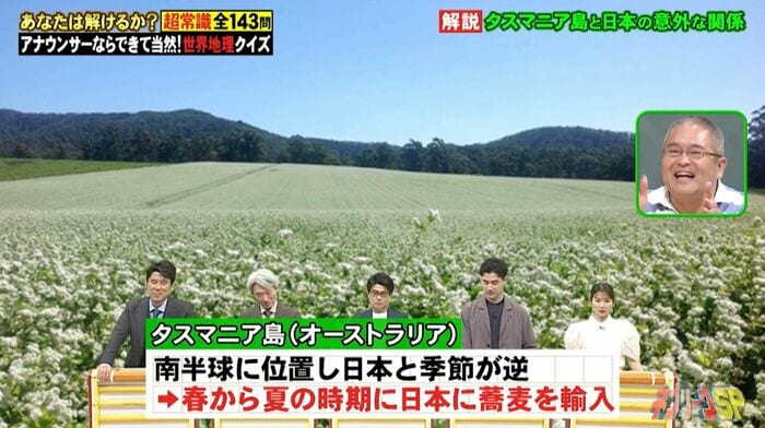 タスマニア島のある国を答える問題でも、村瀬先生は豆知識を伝授しました。オーストラリアにあるタスマニア島では、日本人が愛するある作物が栽培されているそうなのですが、その作物は何でしょうか?