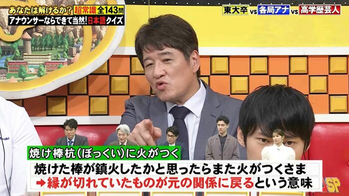 「櫃(ひつ)」という漢字を書く問題と、「焼けぼっくいに火がつく」という慣用句を答える問題では、林修先生がプチ解説を加えました。