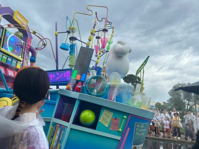 約35分あるベイマックスの“びしょ濡れパレード”では、暑さによって低下したゲストの“エナジーレベル”を上昇させるミッションを任せられたベイマックスが、涼しいミストを撒きながらケアが必要なエリアを探し、ゲストの“エナジーレベル”が著しく低下しているエリアを見つけるとフロートが停止し、水が放たれます。