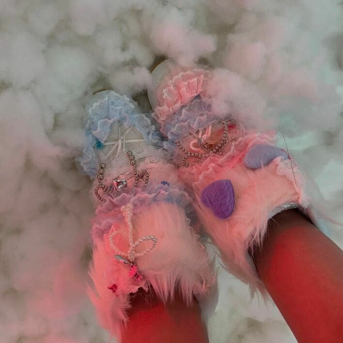 実際に履いた白い靴には、ハートやリボン結びがされたビーズ、水色やピンクのレースがなど、かわいらしいデコレーションがされていました。
