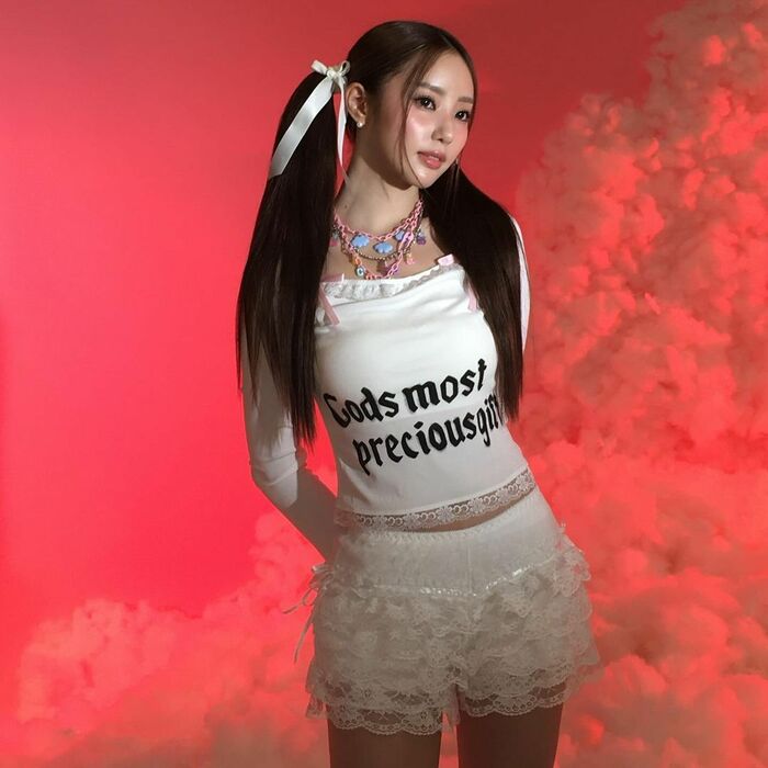 ツインテールにリボンをつけ、レースがついた白い短パン姿を見せています。