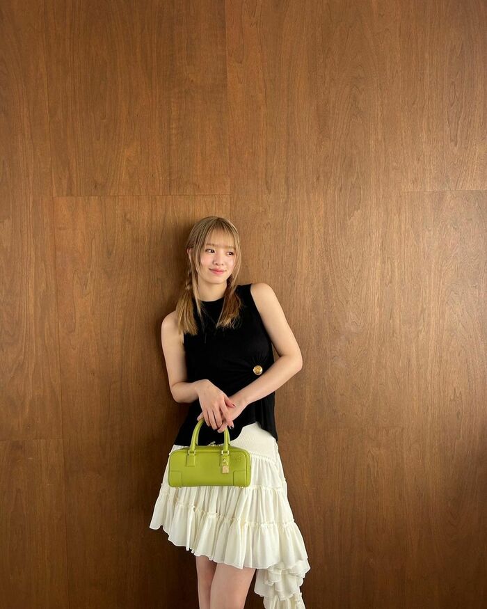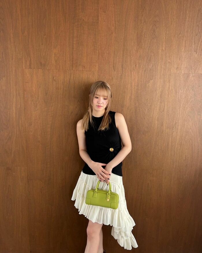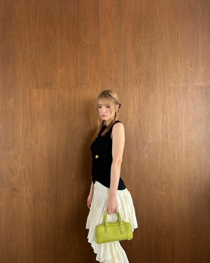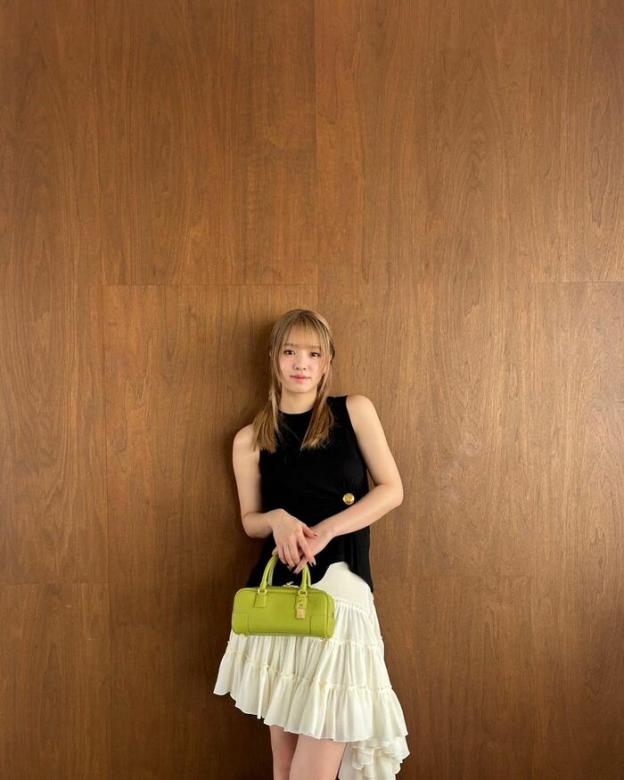 かわいらしい白いフリルのミニスカートを合わせ、手には横田さんが最近お気に入りだという緑色のバッグを持っています。