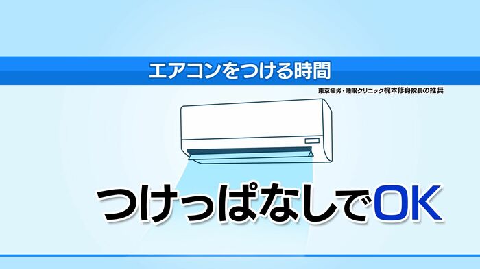 虻川さんが「冷房をつけっぱなしにすると、電気代が気になるのですが…」と不安を述べると、梶本先生は「午前3〜4時に冷房が切れるようにタイマーを設定してほしい」とアドバイス。