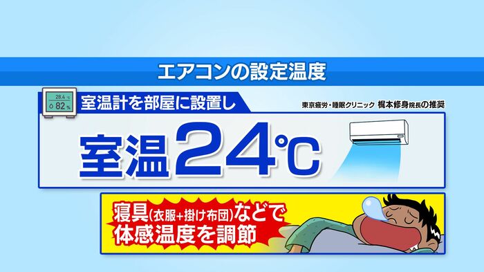 快適な睡眠のためにまず知っておきたいのが「エアコンの適切な温度」。スタジオでは、竹山さんが「24〜26℃」、三上アナは「26℃」、虻川さんが「除湿で24℃」、千秋さんは「28〜29℃」と設定温度はまちまちでしたが、「寝ているときにエアコンが切れると暑い」という点では全員が一致しました。