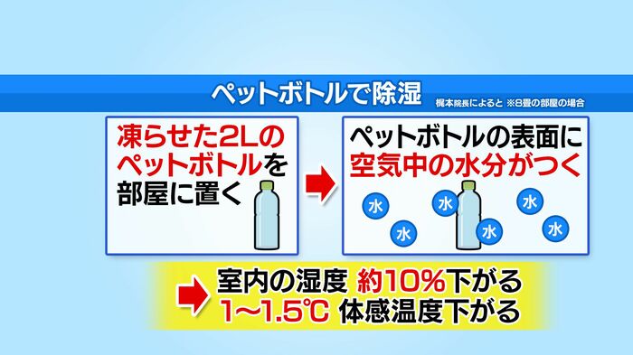 8畳の部屋の場合、2Lのペットボトルを2本置くだけで10%ほど湿度が下がり、体感温度を1〜1.5℃下げることができるといいます。