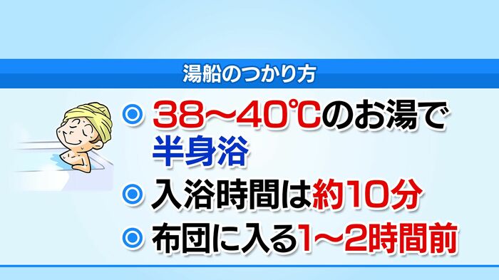 梶本先生は、寝る前にオススメのルーティーンも紹介。まずお風呂は「38〜40℃で半身浴」「入浴時間は10分ほど=汗が出始めるくらいが目安」「入浴は布団に入る1〜2時間前」が理想だといいます。