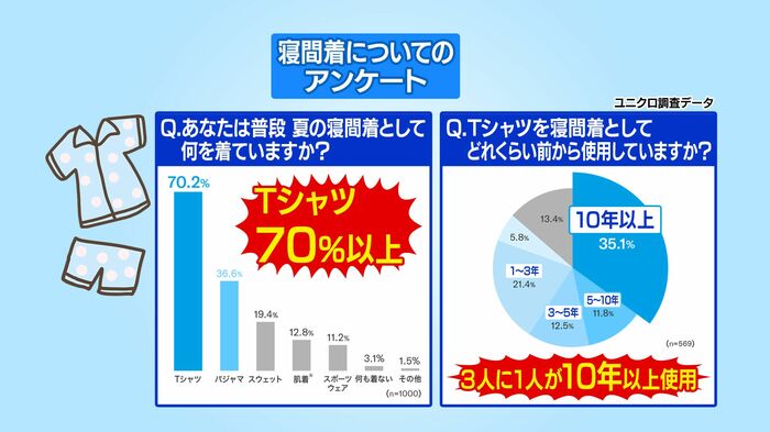 「体温は汗が蒸発するときに下がるので、長袖&長ズボンのほうが速やかに体温を下げることができる」というのが理由だそうですが、アンケート調査によると夏の寝巻きは「Tシャツ」の人が70%以上で、しかも3人に1人は「10年以上同じTシャツを着ている」という結果が出たといいます。