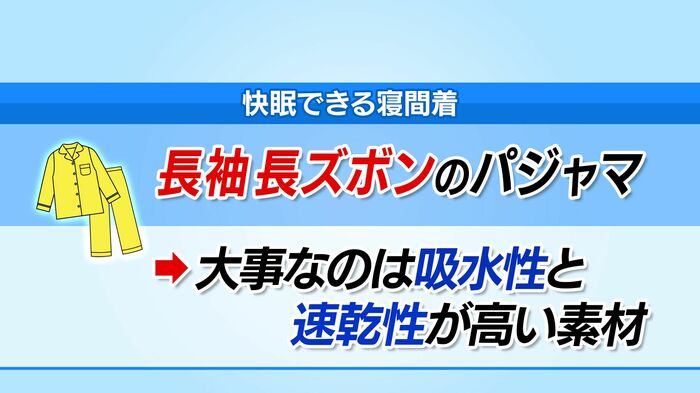 寝る時の衣類については、梶本先生が「吸水性と速乾性の高い素材の長袖&長ズボン」をオススメしました。