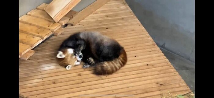 他のシセンレッサーパンダたちも⾏うことがあるそうなのですが、「⾵花」が⼀番よく『ばんざい寝』を見せるそうです。
