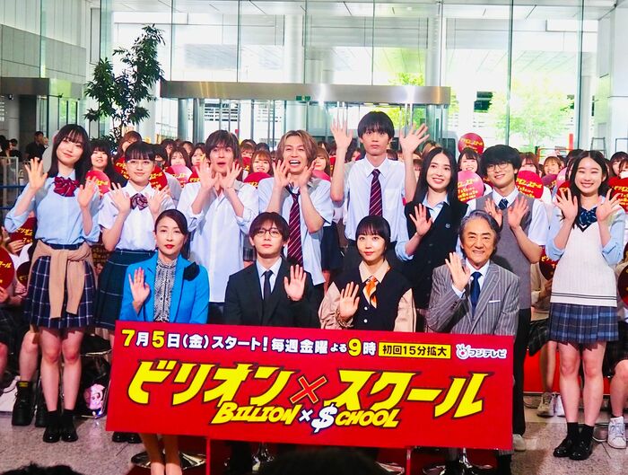 ドラマ『ビリオン×スクール』の制作発表会見が6月27日にフジテレビ本社で行われ、山田涼介(Hey!Say!JUMP)さん、木南晴夏さん、水沢林太郎さん、松田元太(Travis Japan)さん、水野美紀さん、市村正親さんが出席しました。