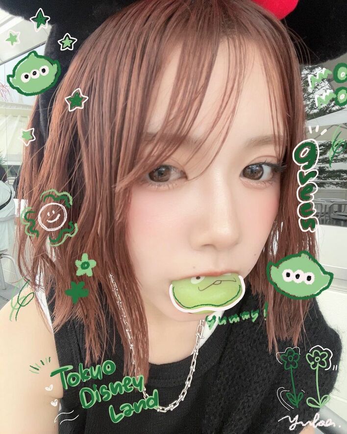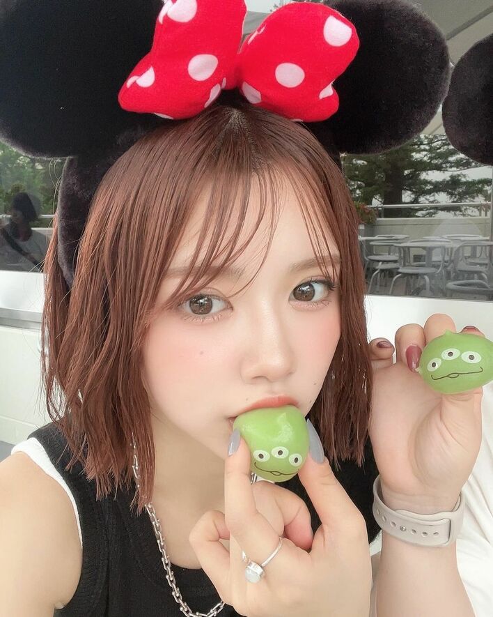 雨の日のディズニーランドで高梨さんは、ミニーのカチューシャをつけてリトルグリーンまんを口にくわえた、かわいすぎるもぐもぐショットを公開しました。