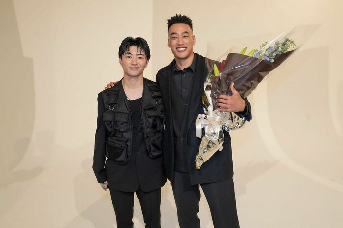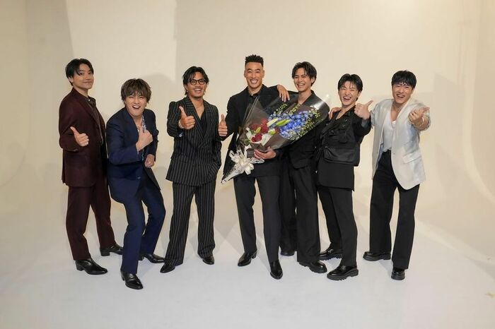 写真には、関口さんに加え、メンバーの白濱亜嵐さん、片寄涼太さん、数原龍友さん、小森隼さん、佐野玲於さん、中務裕太さんと映ったクールな装いの7人の姿が!カメラに向かって笑顔を見せていました。