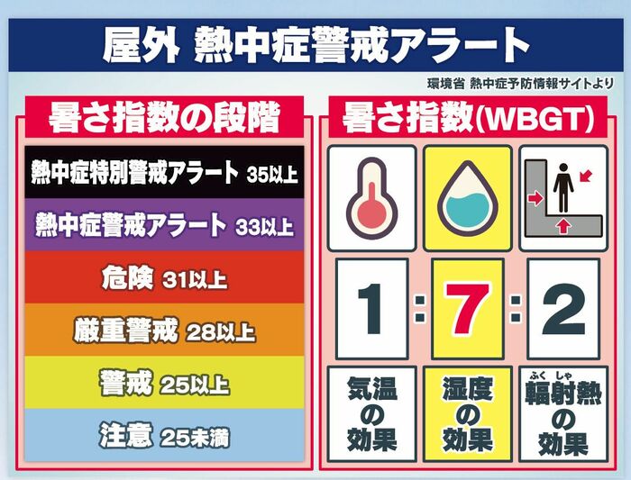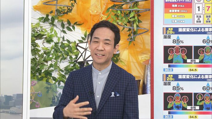 ――屋外の熱中症警戒アラートの暑さ指数を見てみると、気温の効果は「1」、輻射熱の効果は「2」、そして湿度の効果は「7」と一番高く、湿度が影響が大きいということが分かります。
