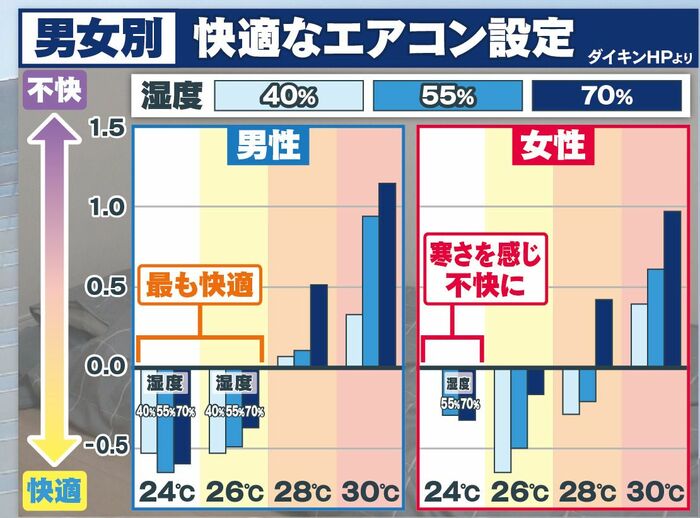 気温が26℃~30℃でも湿度が低ければ快適となるのですが、男女で見てみると、女性は気温が24℃で湿度が低いと寒さを感じ、不快になる人もいました。