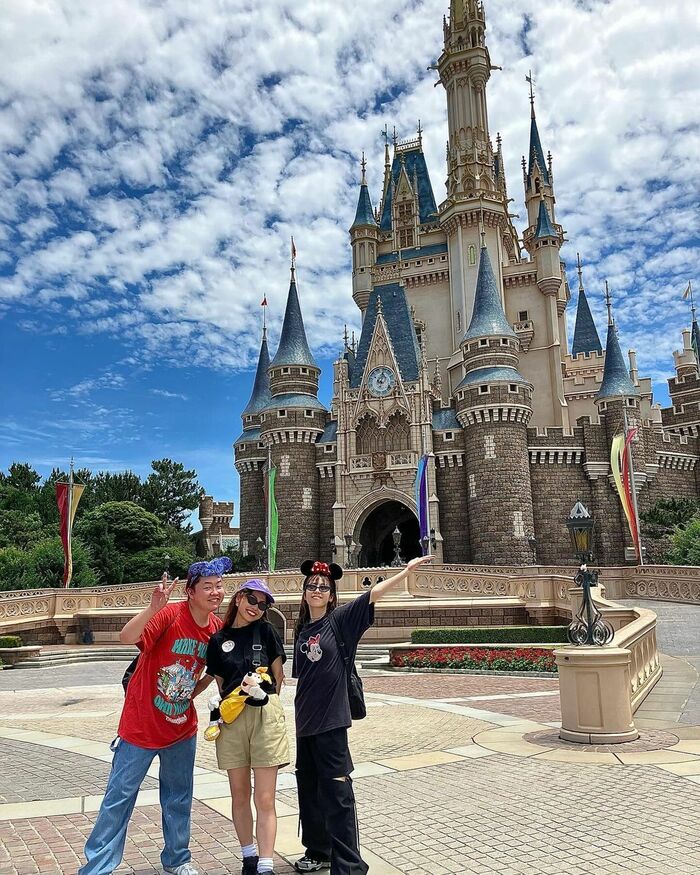 公開されたショットには、シンデレラ城の前で、pecoさんを中心に3人とも笑顔を見せています。