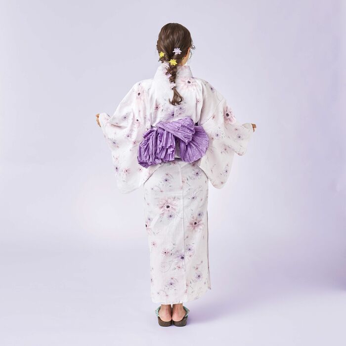 ラベンダーやピンクなど、キャラクターカラーをイメージした帯は、簡単な結び方でもくしゅっとふんわり華やかな仕上がりに。