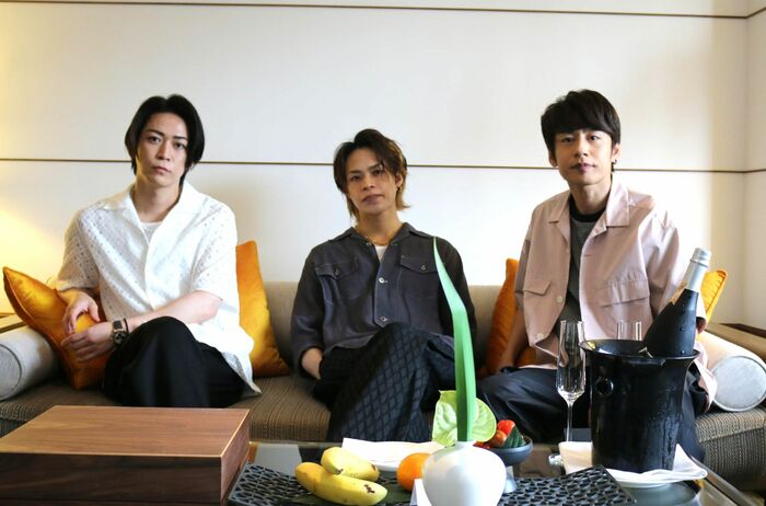 部屋のソファにゆったり座った亀梨さんが、「明日のスケジュールは?じいや」と振ると、中丸さんが「4時から取材が…誰がじいやや!」とノリツッコミ。
