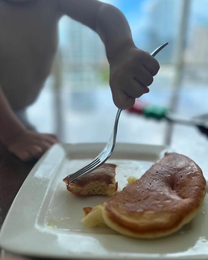 「まったく買い出しも行けてなくて日本から持ってきたホットケーキミックスと水だけで作ったパンケーキが美味しすぎた件 人形焼みたいやった」とつづり、写真には倫壽くんと思われる姿が映っており、フォークを使ってパンケーキを食べようとしていました。